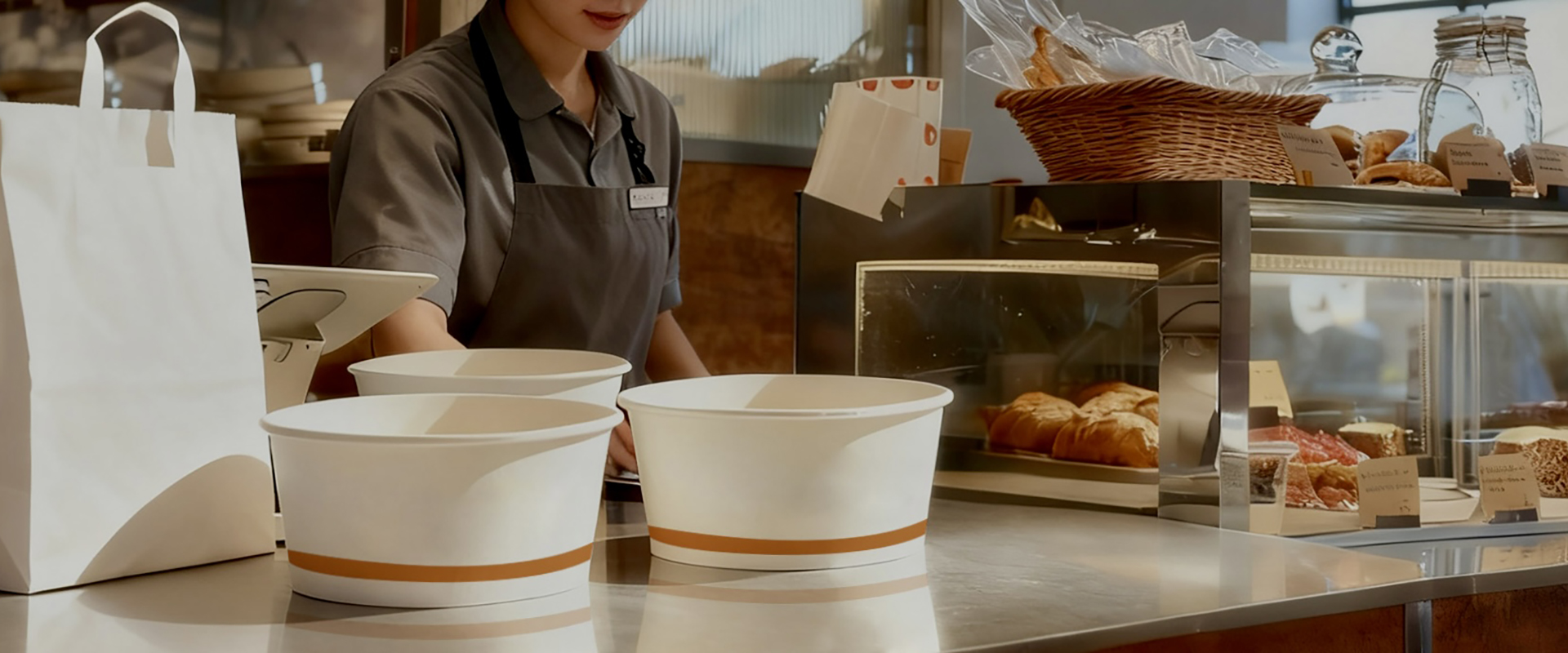 PRO-Service in der Lebensmittelverpackungsindustrie. Heutzutage bevorzugen sowohl Gastronomiemarken als auch Verbraucher Papierbehälter als Take-Away-Verpackung. Papierbehälter sind in der T...